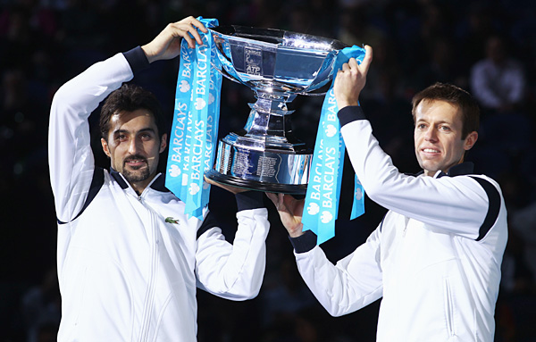 ダブルスを制したジモンイッチ(左)とネスター 通算5度目のツアーファイナル制覇を果たしたフェデラー